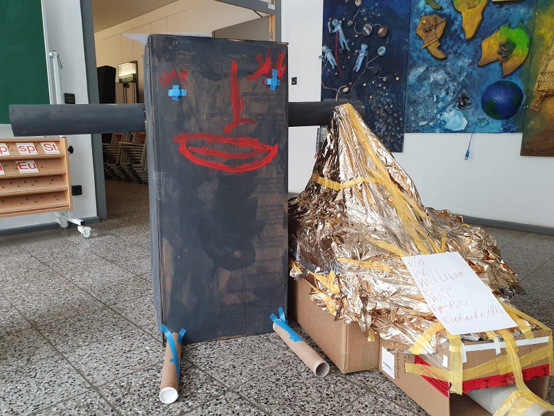 In der 4. Ferienwoche beschäftigten wir uns mit Gestaltungsmöglichkeiten, um aus "Müll" Neues zu erschaffen. Im Vorfeld haben unsere Eltern Pappkartons, Pappröhren, Joghurtbecher, Kronkorken und vieles mehr gesammelt und mitgebracht.