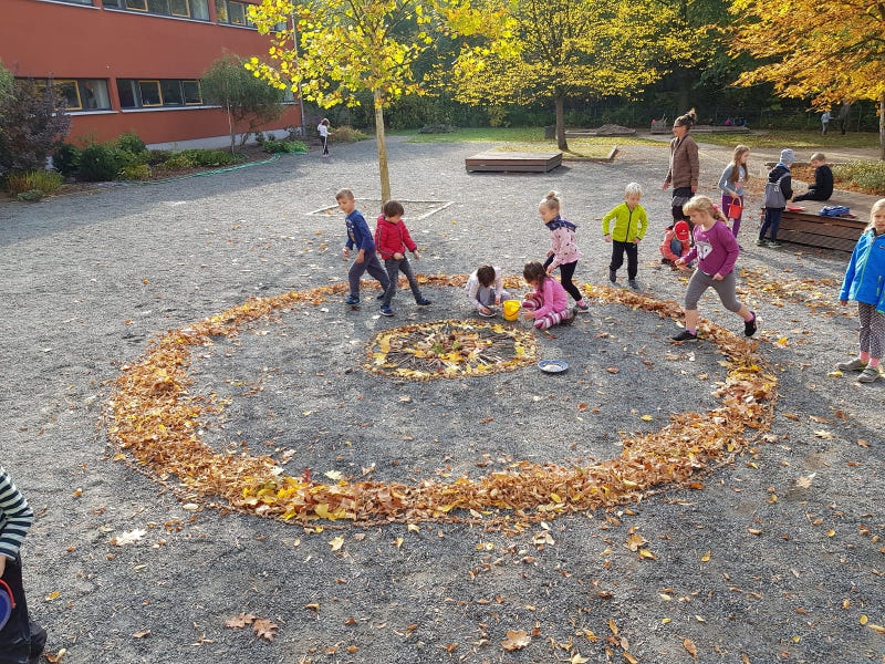 Die Ferienkinder gestalteten an einem goldenen Herbsttag ein riesiges Mandala aus Naturmaterialien.