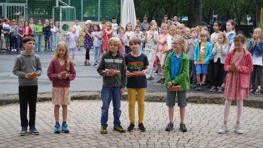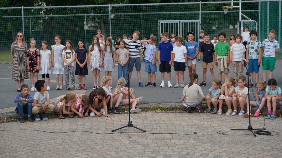 Mit "Hallo! Hallo! Hallo!" begrüßte die Klasse 1b singend die zahlreichen Gäste am Freitag. In diesem Moment startete das lange vorbereite Schulfest. Ein Mix aus Sonne und leichter Bewölkung sorgte für angenehme Temperaturen.