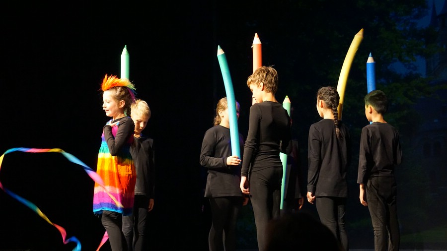 "Nanu, was haben wir denn hier?" Auf der Theaterbühne liegen einige riesige Buntstifte kreuz und quer. "Weiß jemand, wem sie gehören?"