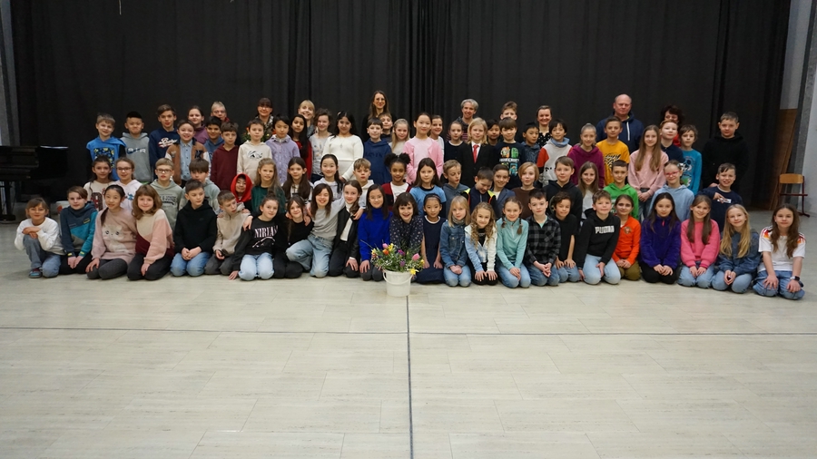 Kraftvoll und rund breitet sich der Klang des Cellos von Bence (Kl. 2a) in der Aula aus. Vier Klassen schauen ihn erwartungsvoll an.