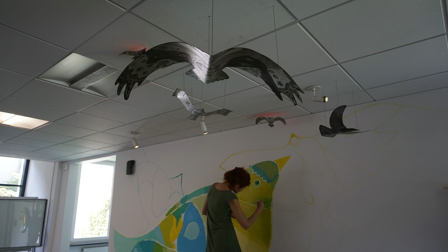 Den Auftakt der Projektwoche bildete die Einweihung unseres Foyers. Eine Installation, bestehend aus einem Wandgemälde und bearbeiteten Metallplatten, wurde unter dem Titel "Der Flügelschlag" feierlich eingeweiht.