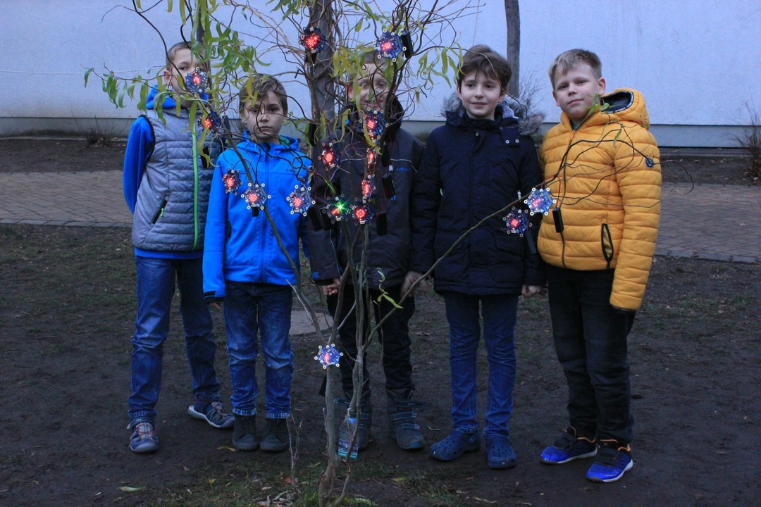 Mit Weihnachtssternen der etwas anderen Art schmückten heute die IT-Freunde der BIP Kreativitätsgrundschule Dresden einen kleinen Baum auf dem Schulhof.