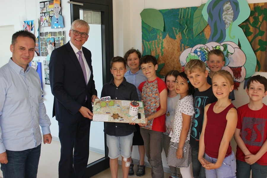 BIP Schüler übergeben Exponat mit selbst programmiertem Microcontroller an Dresdens Bildungsbürgermeister Hartmut Vorjohann.