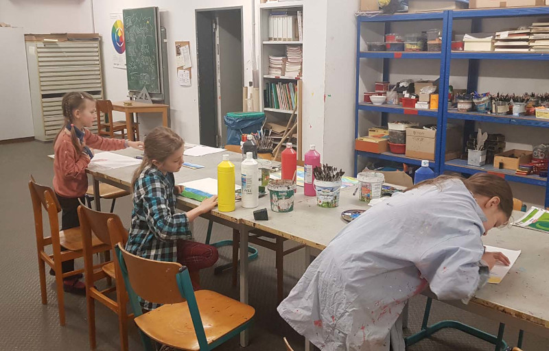 Zum Thema "Die vier Urelemente in der Kunst" gestalteten die Kinder mit Tempera Bilder über das Wasser und die Luft sowie deren Lebenswelt.