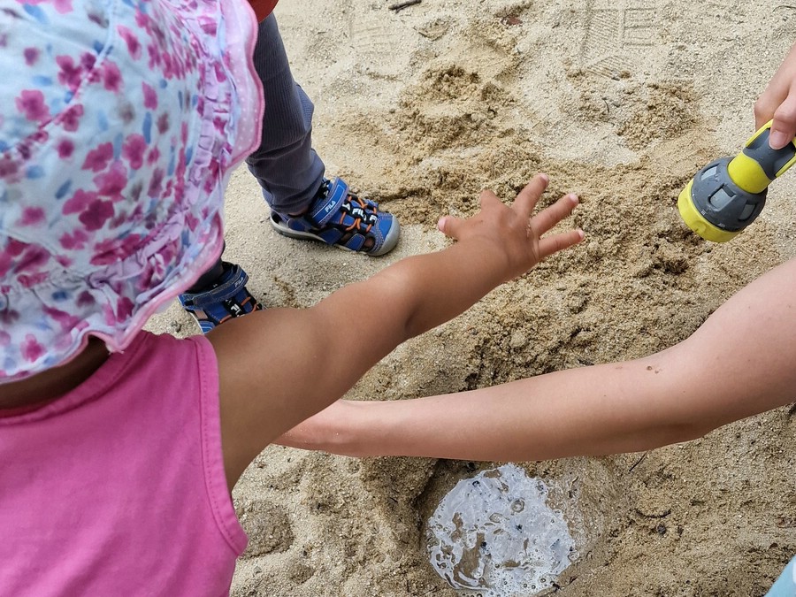 Wenn unsere jüngsten Krippenkinder im Sandkasten spielen, dürfen natürlich die begleiteten Experimente nicht fehlen.