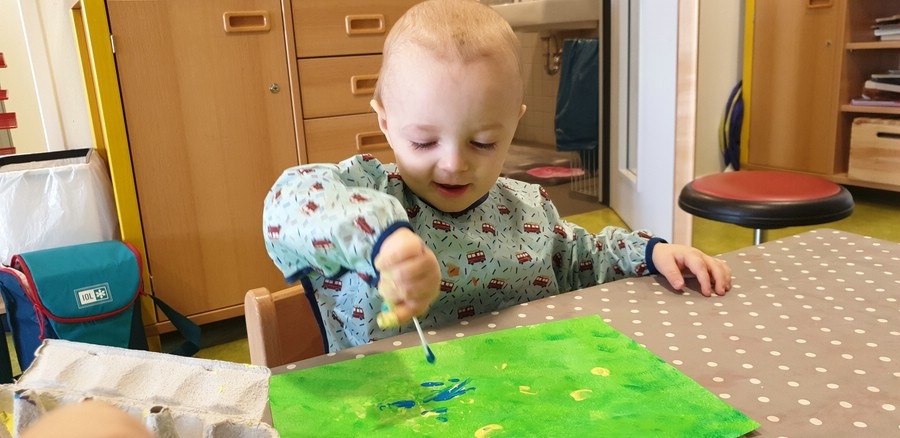 Als sich zu Ostern unsere Vier- bis Fünfjährigen der Mittleren Gruppen eine neue Technik aneignen wollten, um ihren Eiern wunderschöne Osterkleider zu erschaffen, fragten wir uns, ob diese Technik nicht vielleicht etwas mit dem Mammut zu tun hätte.