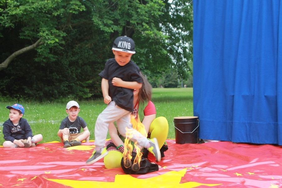 Wenn das Jahresthema eng verbunden mit dem Zirkustreiben ist, was liegt dann näher als im Rahmen der Kindertagsfeierlichkeiten einen echten Clown einzuladen und sich selbst dem Zirkushandwerk zu stellen.