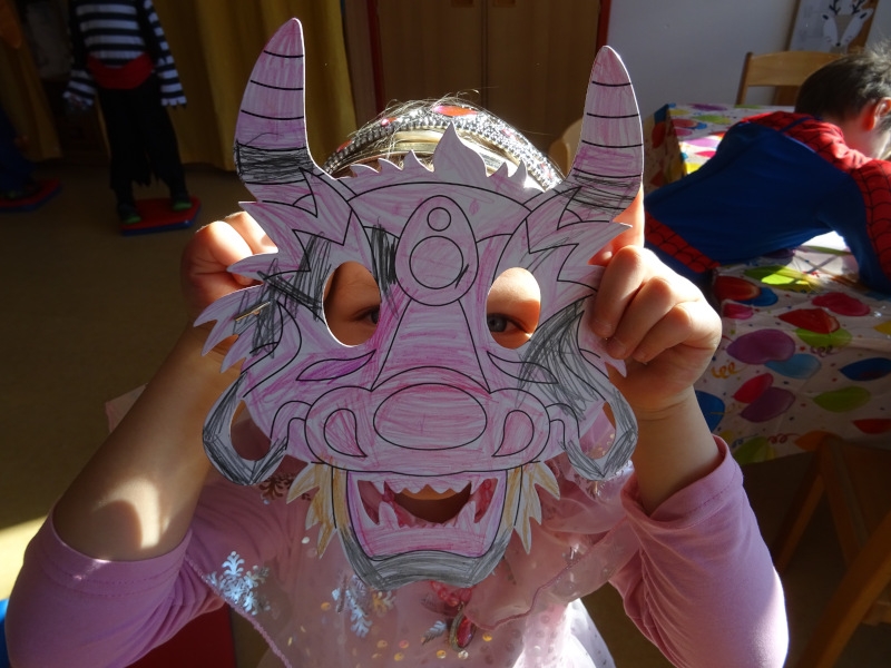 Nach dem beschwingten Frühstück starteten wir mit der Kostümvorstellung, gefolgt von einer zünftigen Polonaise. Lustige Spiele, bewegungsintensive Tänze, aber auch das Verschnaufen in der ruhigen Maskengestaltungs- und Malecke füllten den Vormittag.